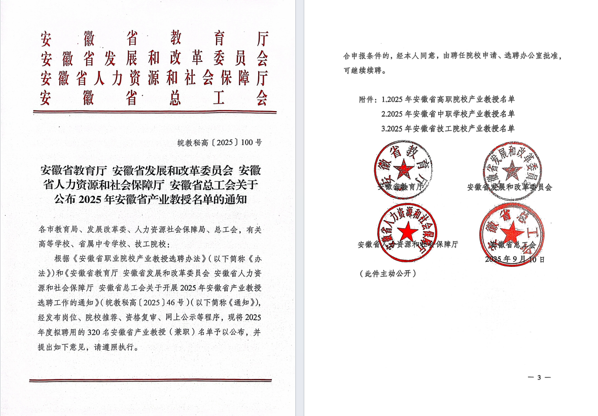 根據(jù)《安徽省教育廳 安徽省發(fā)展和改革委員會 安徽省人力資源和社會保障廳 安徽省總工會關于公布2025年安徽省產(chǎn)業(yè)教授名單的通知》(皖教秘高〔2025...